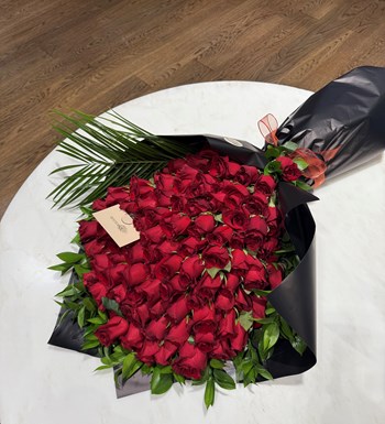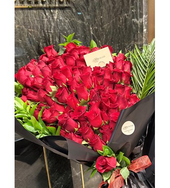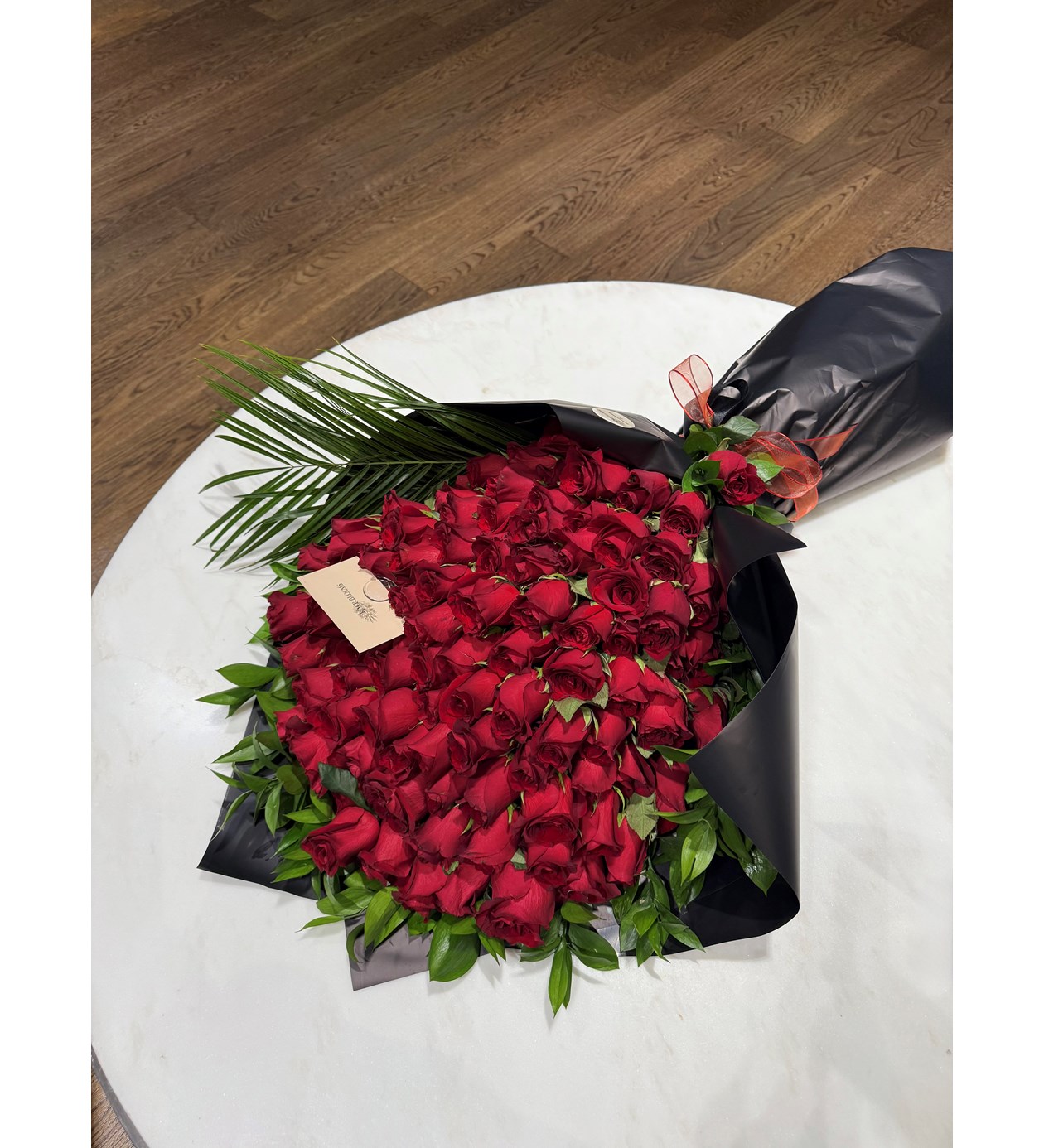 Siyah ambalaj ile hazırlanan 100 adet kırmızı gül buketi