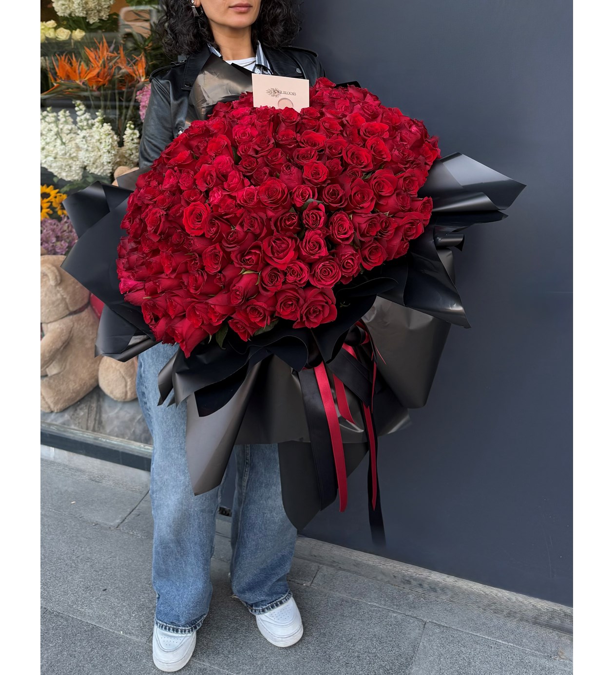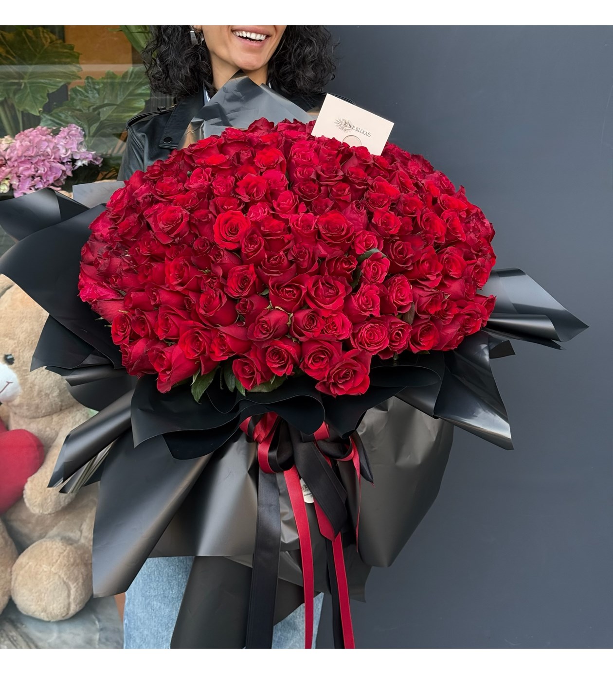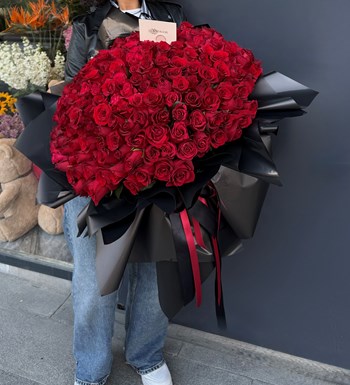Siyah ambalaja hazırlanan sevdiklerinizin yüzünde kocaman gülümse bırakan kucak dolusu gül buketi