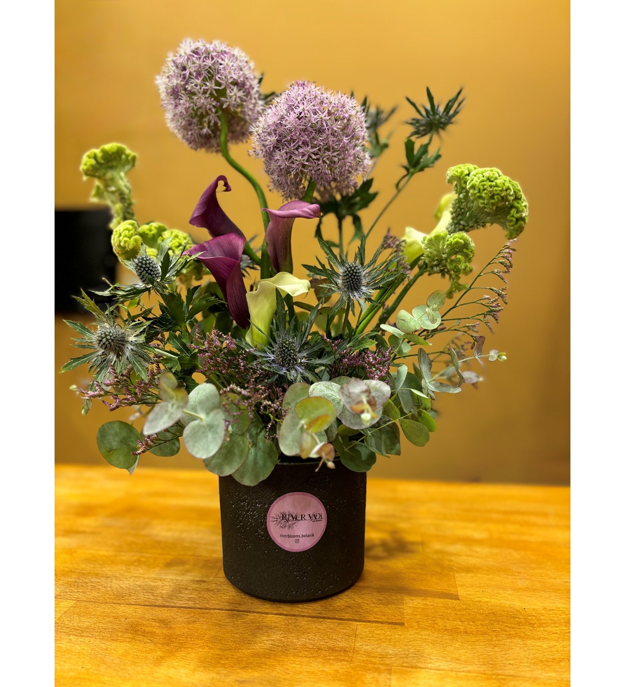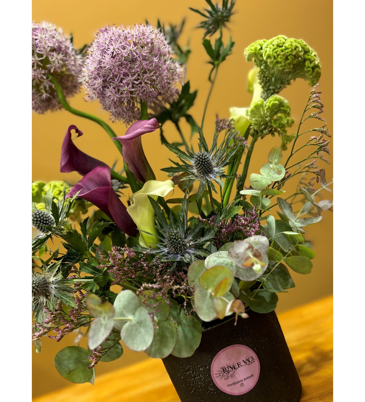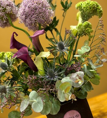 Allium, gala, celosia, erginum, eryngium, limonium ve okaliptus ile siyah objeye hazırlanan aranjman