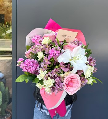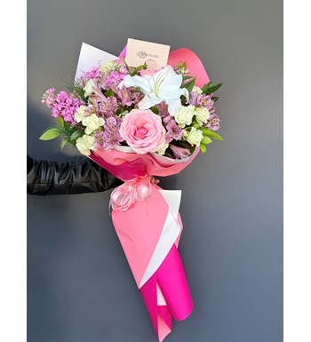 Alstroemeria, şebboy, gül ve lilyum mix buket