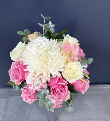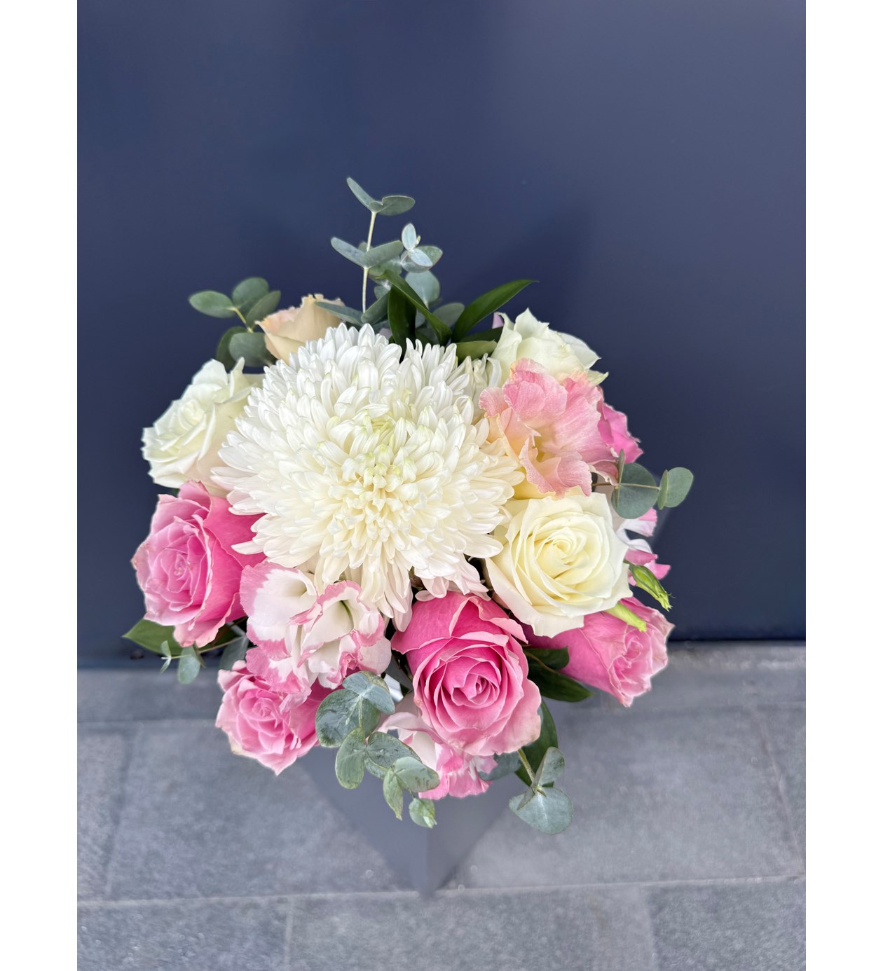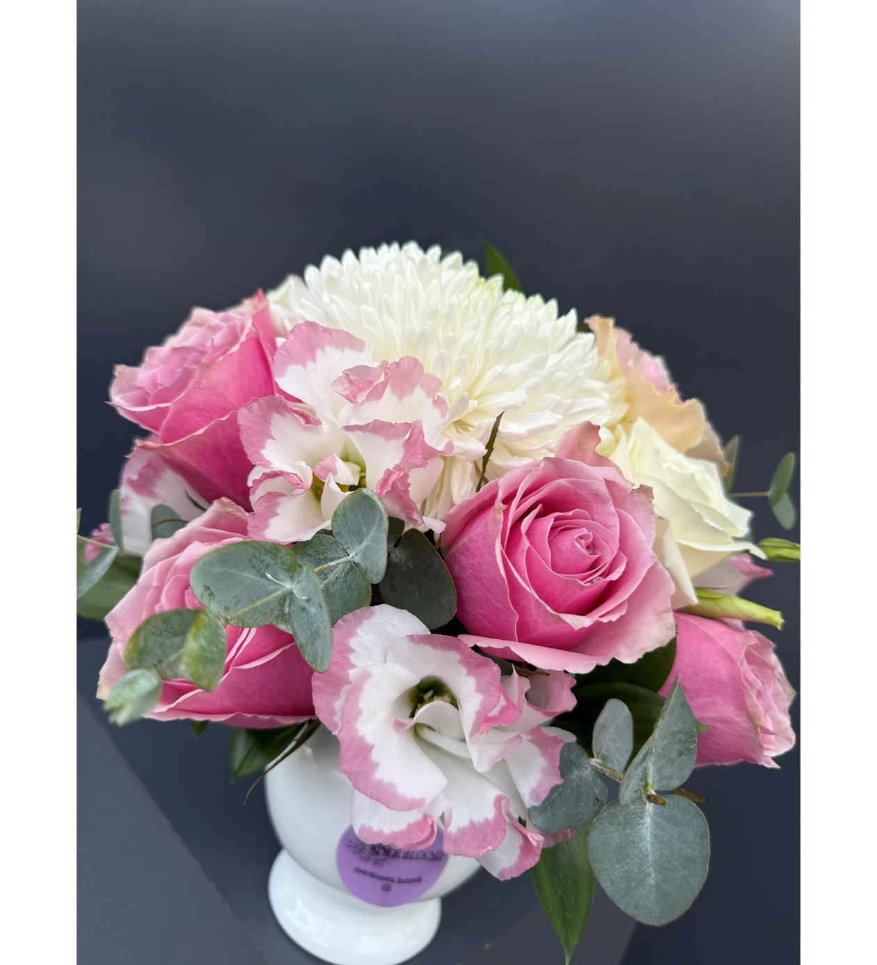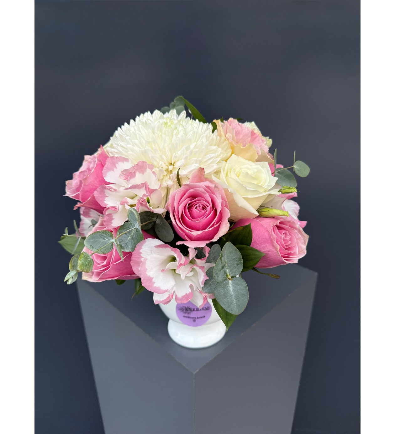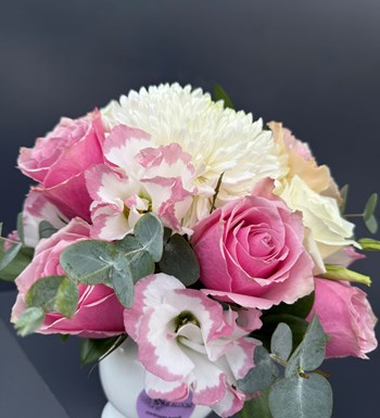 Beyaz objede pembe, beyaz gül, lisiantus ve anastasia ile özenle hazırlanmış mini aranjman...