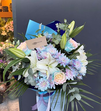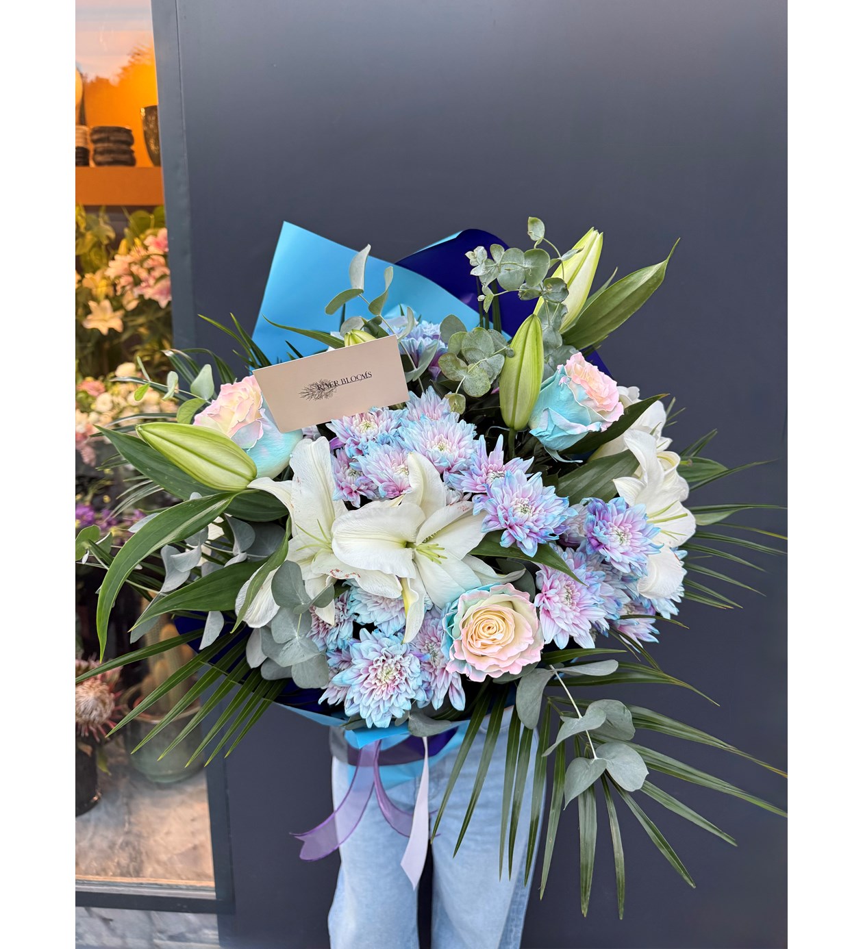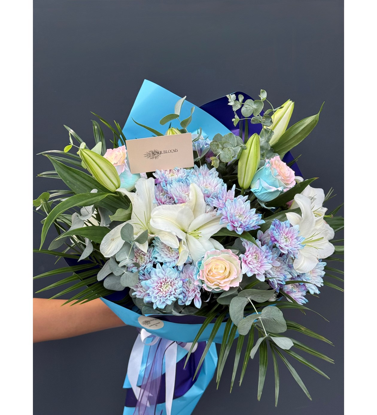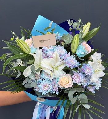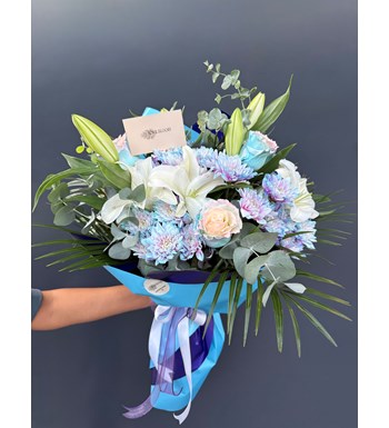 Taze yeşillikler ile hazırlanan mavili beyazlı ekvator gülü, lilyum ve anastasia mix buket