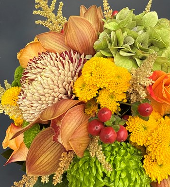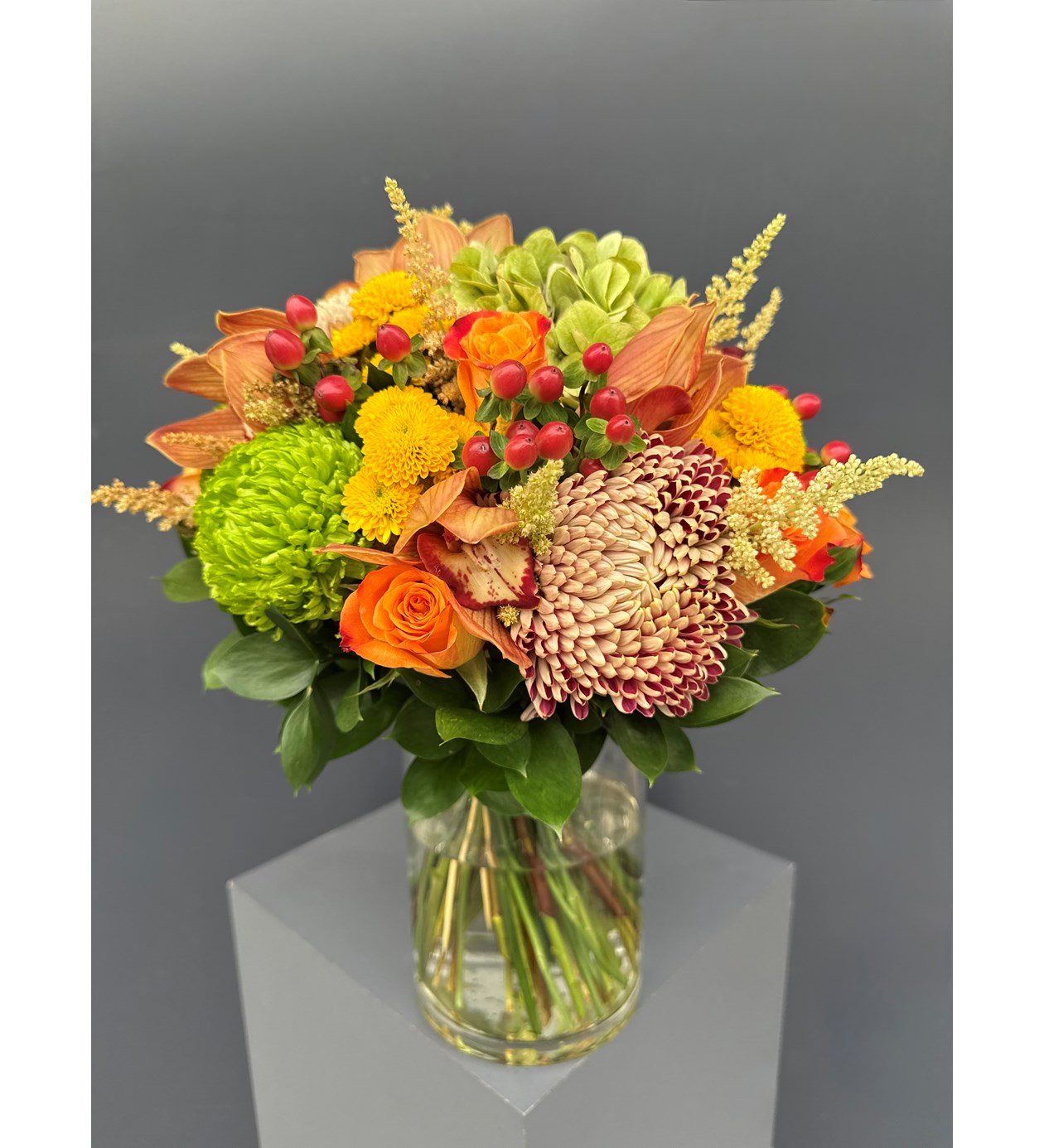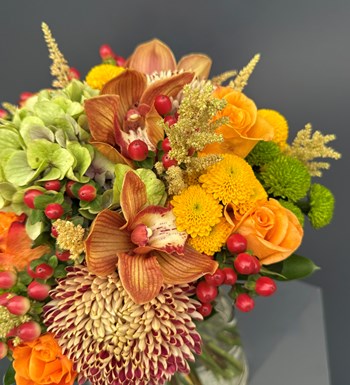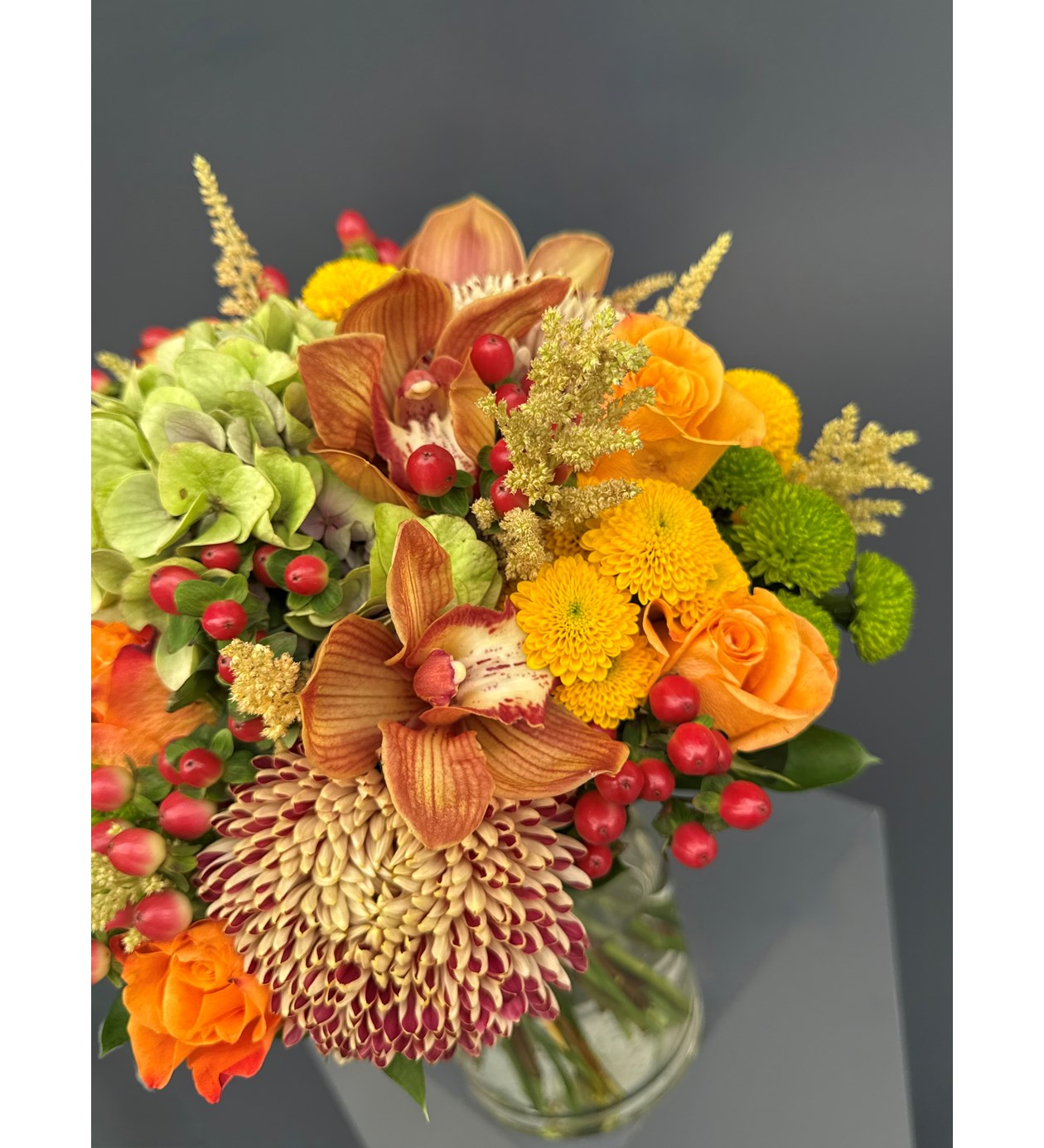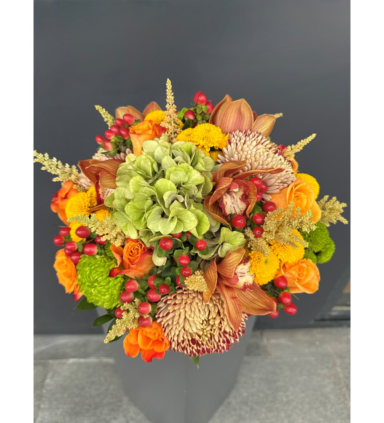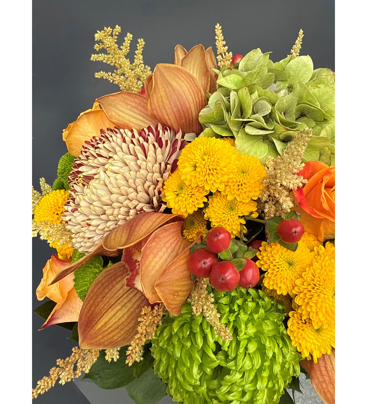 Cymbidium Orkide, yeşil somon renk Anstasia, sarı yeşil Biçme, Hypericum, Ortanca ve Ruskus ile hazırlanan Cymbidium Orkide Detaylı Vazoda Orange Çiçekler ile sevdiklerinizin veya kendinizin ister evini ister ofisini renklendirin.