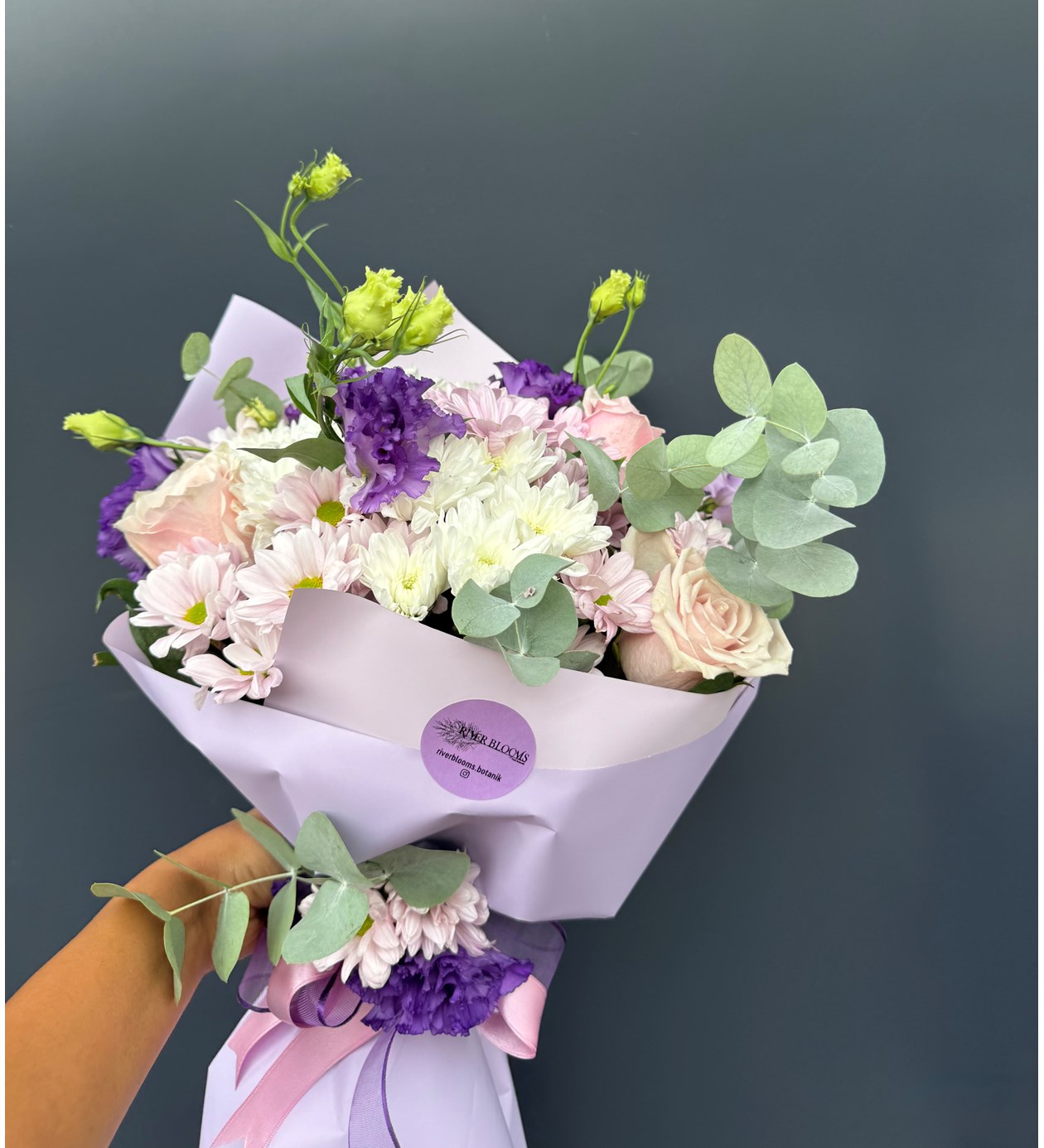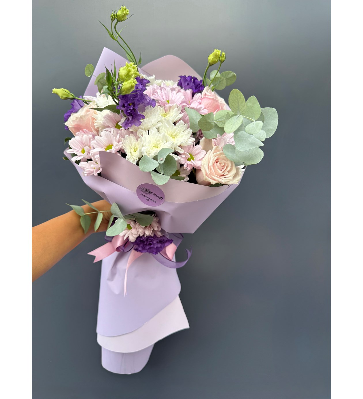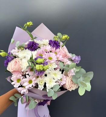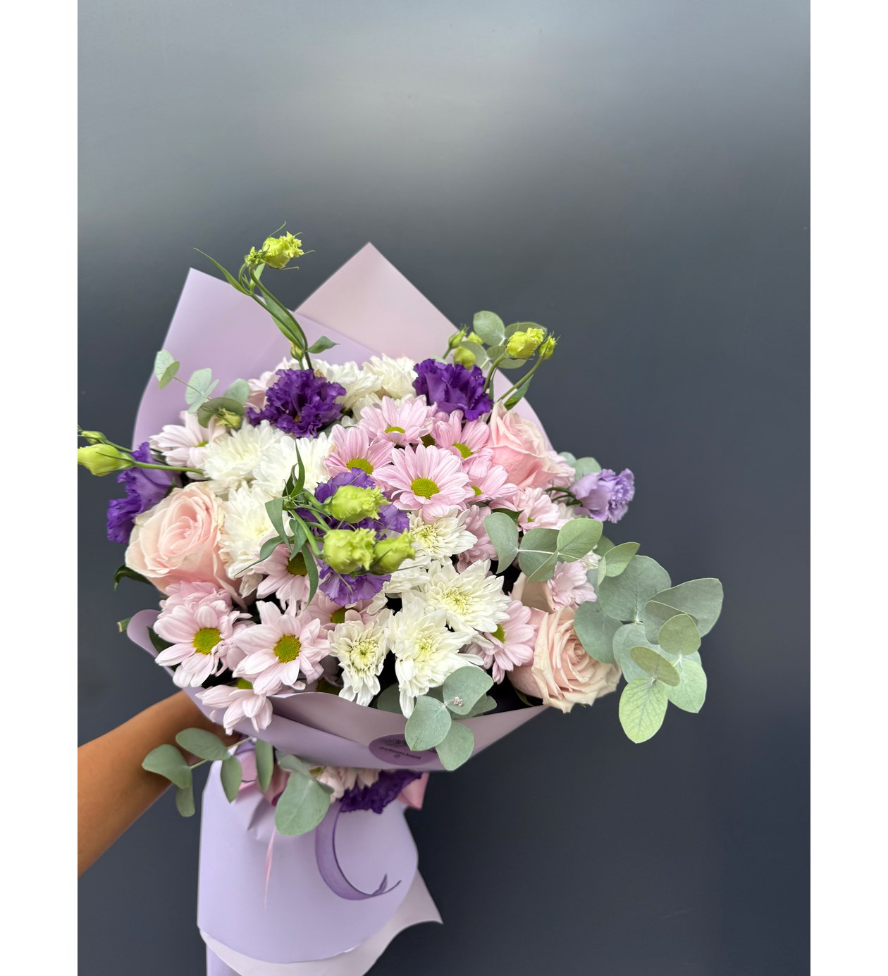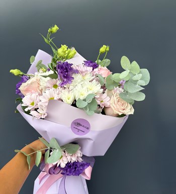Pembe gül, mor lisiantus, kırçiçeği ve okaliptus yaprakları ile hazırlanan mix buket