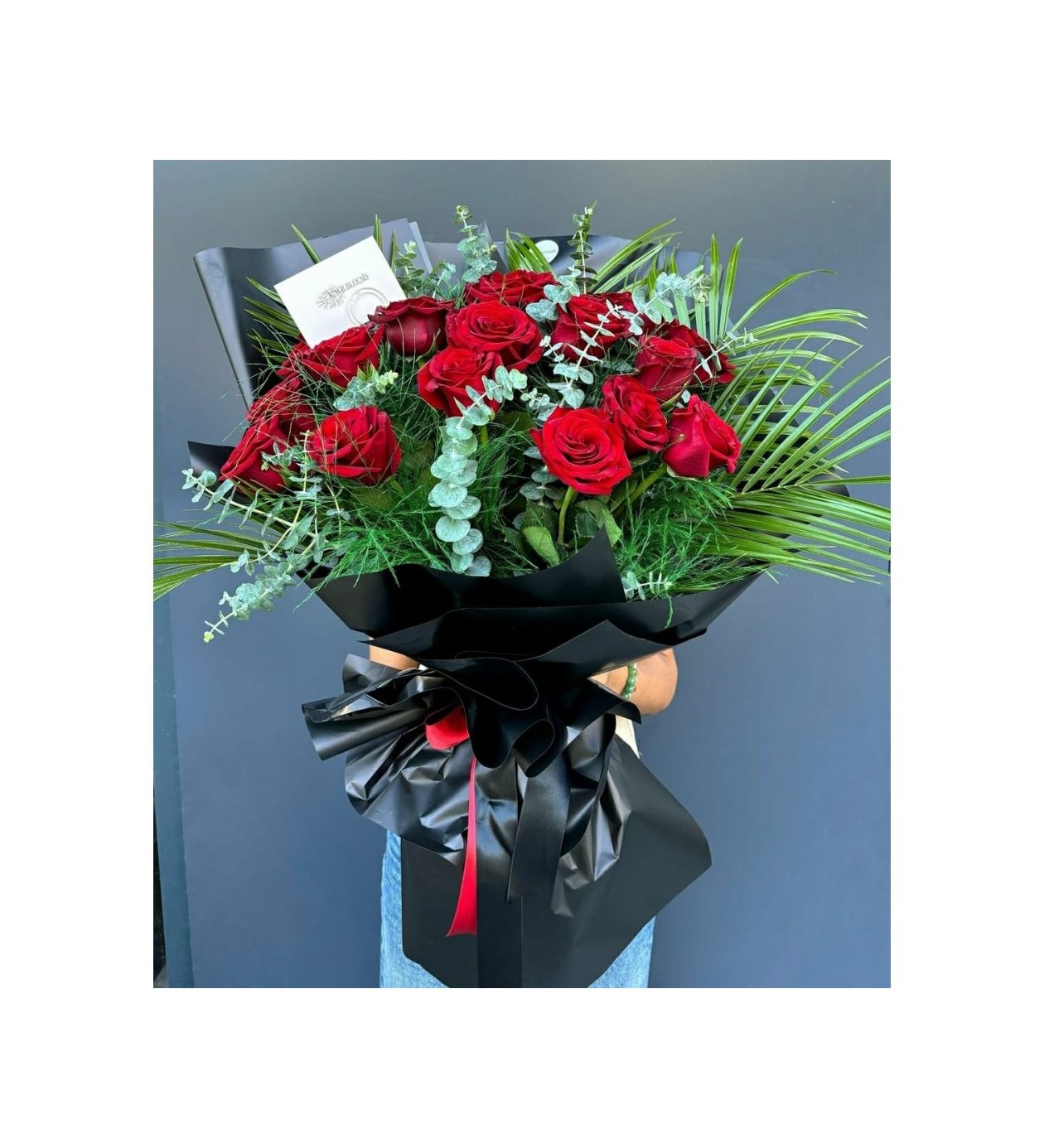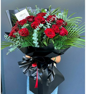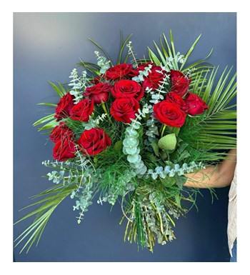 Taze yeşillikler ile hazırlanan 20 adet ithal kırmızı gül buketi