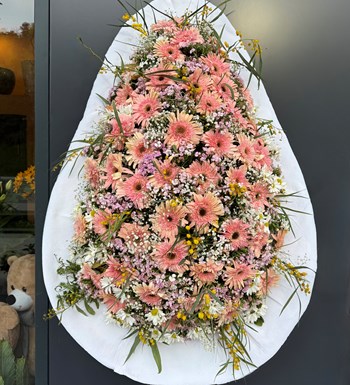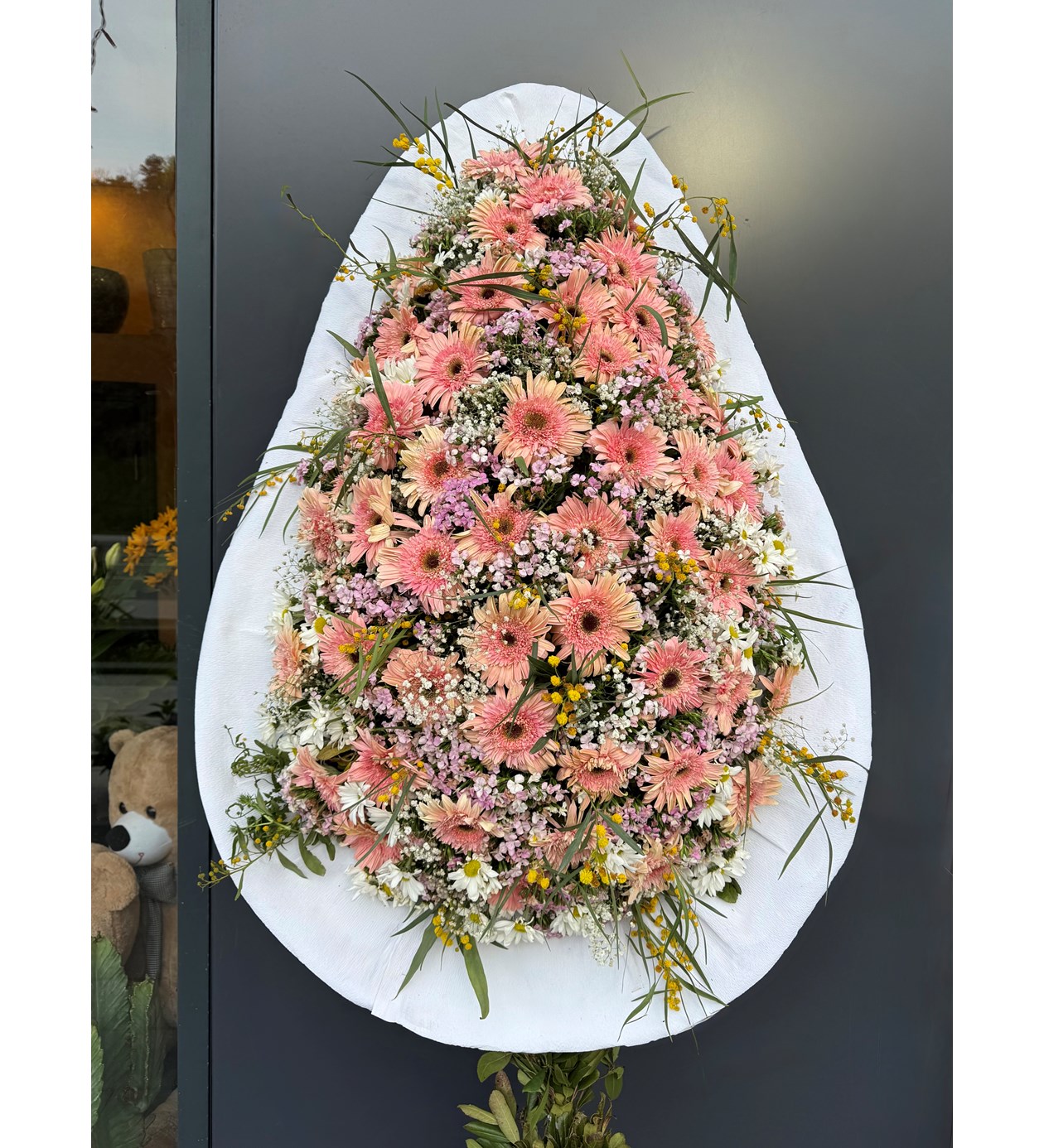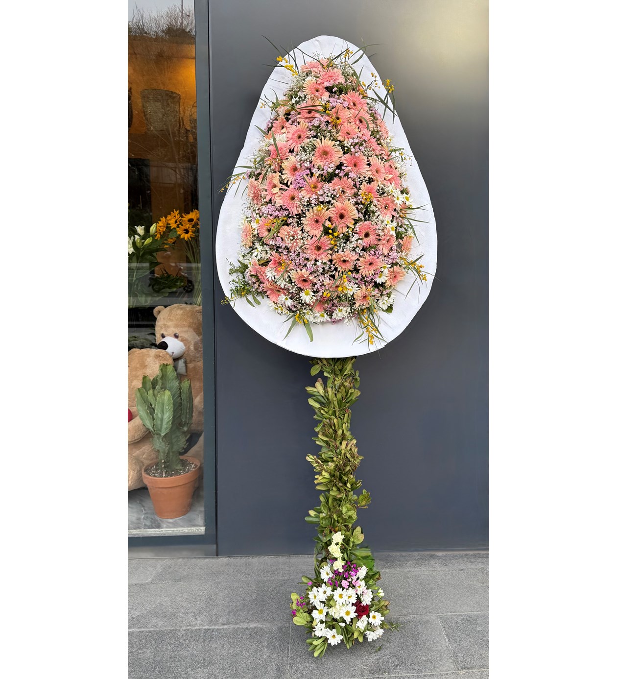 Pembe gerbera ve kırçiçekleri ile hazırlanan sepet (çelenk) düğün, açılış veya davetleriniz için tercih edebilirsiniz.