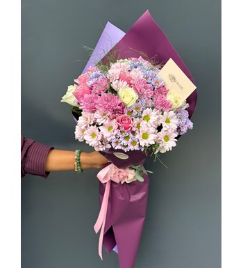 Pembe beyaz gül, pembe papatya ve kırçiçeği buketi