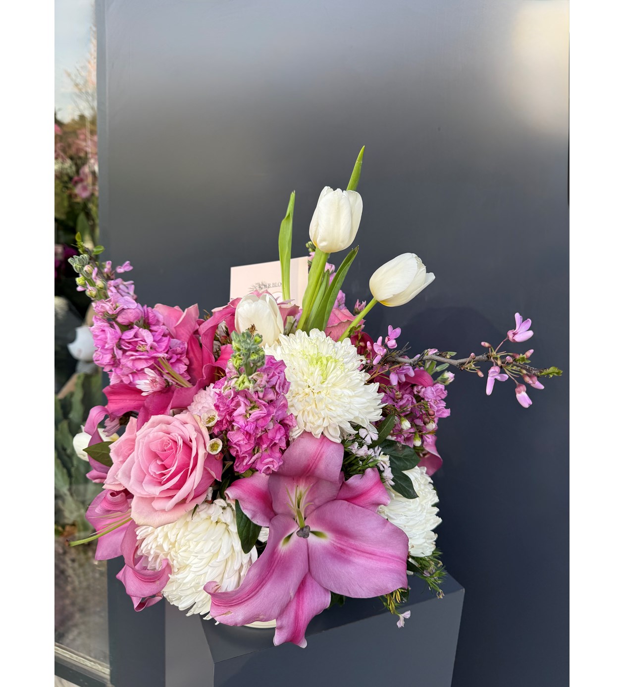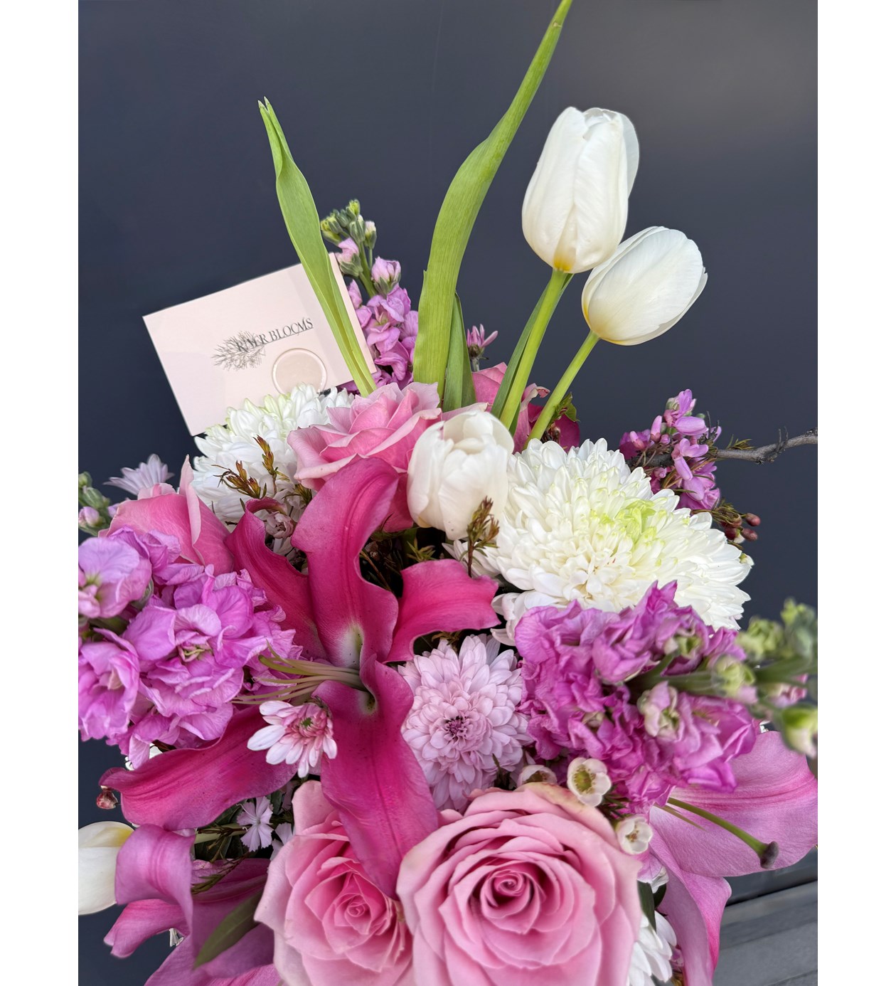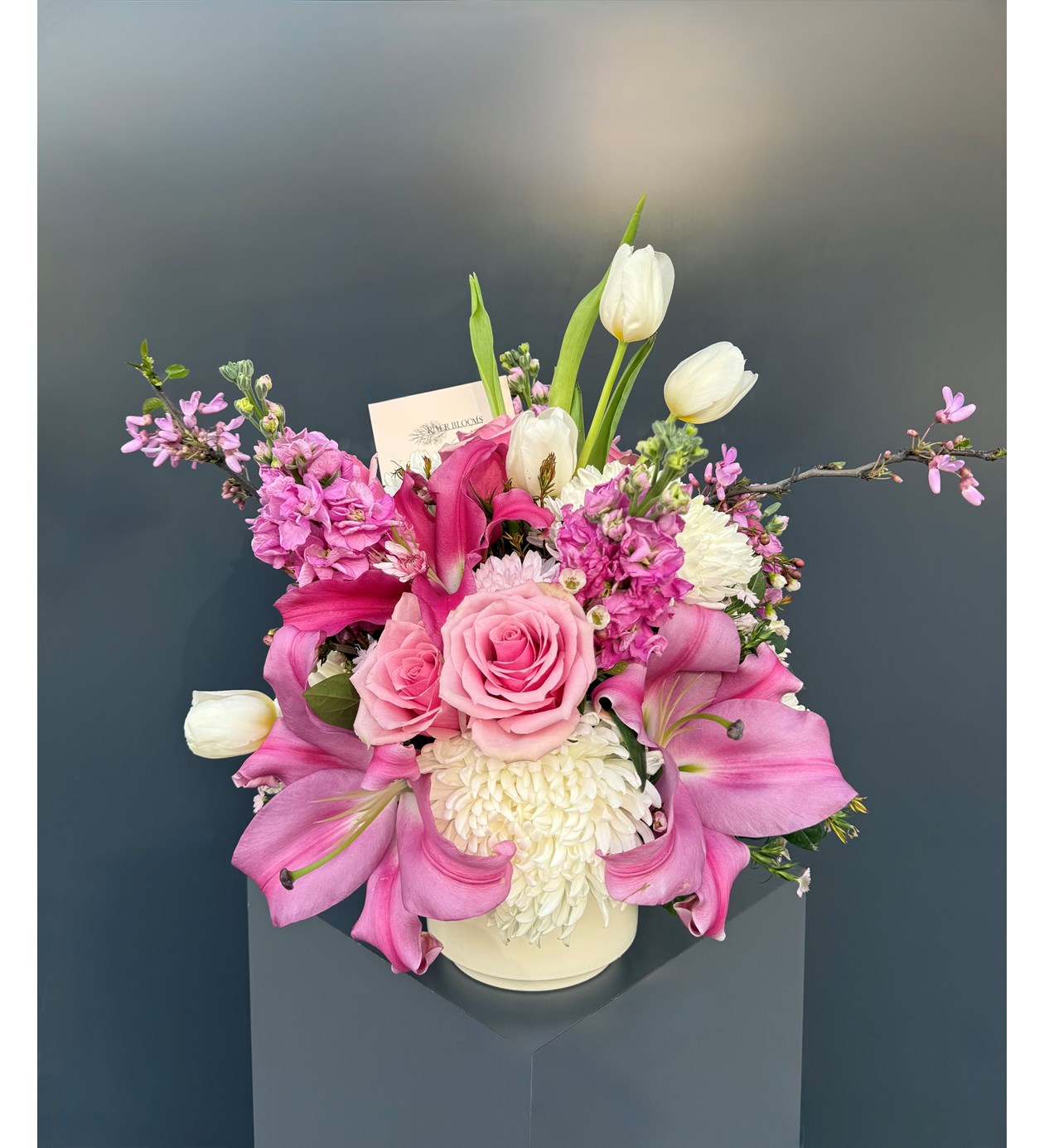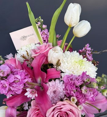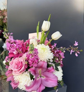 Pembe ve beyazın muhteşem uyumu olan lilyum, anastasia, gül, no lale ve şebboy ile hazırlanan mix aranj