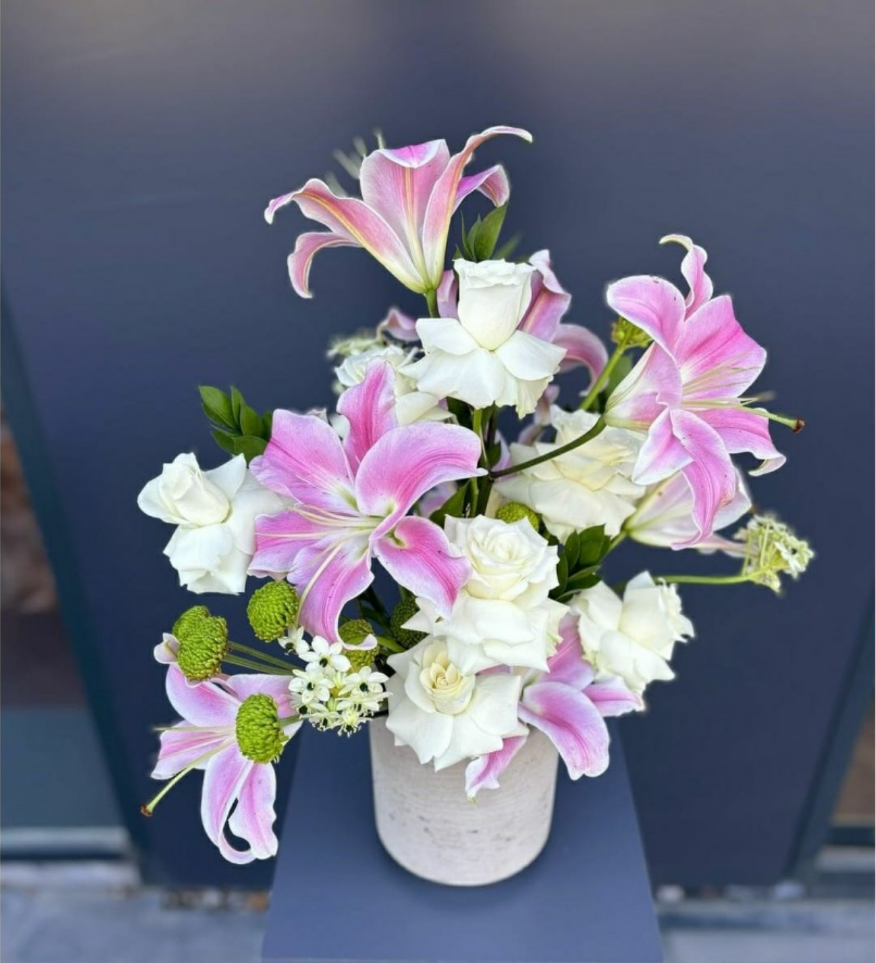 Beyaz gül ve pembe lilyum ile hazırlanan saksıda aranjman