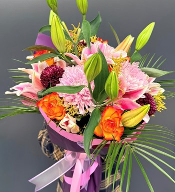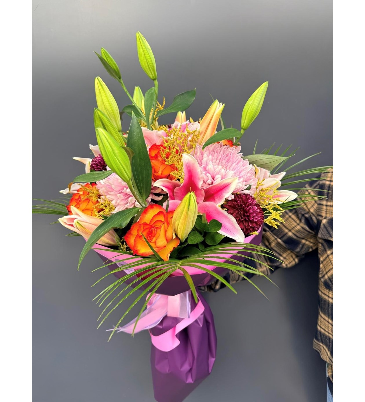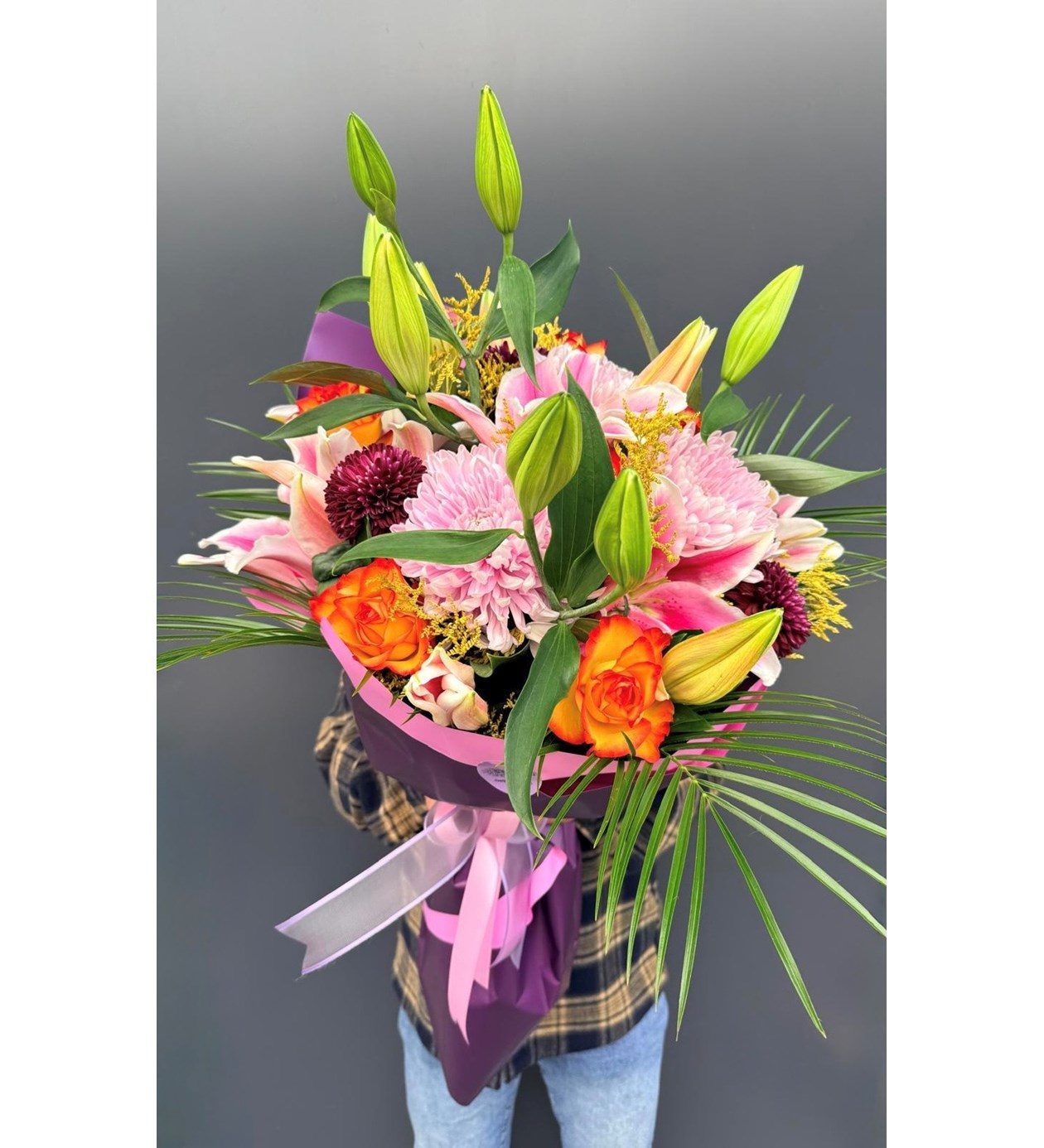 Pembe Anastasia, mor top Anastasia, turuncu Gül, pembe Lilyum ve taze yeşillikler ile hazırlanan Pink & Orange Doğum Günü Buketi ile sevdiklerinizin özel gününü kutlamak ve mutlu etmek için tercih edebilirsiniz.