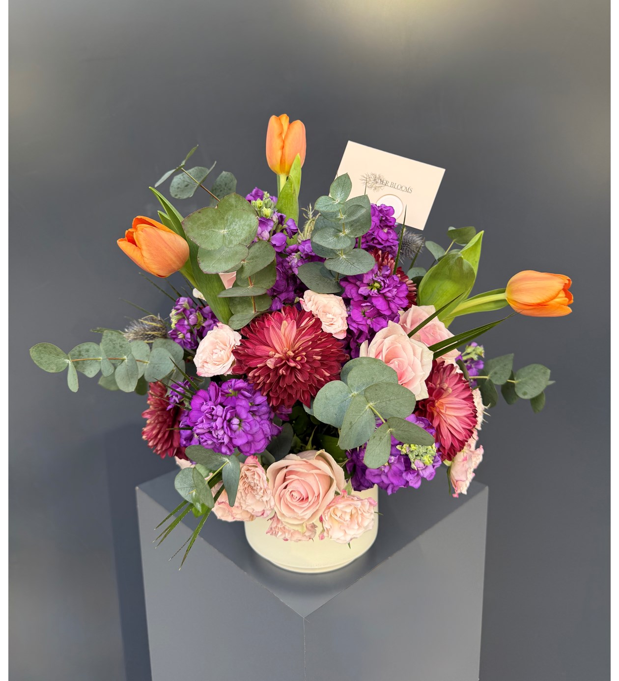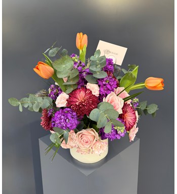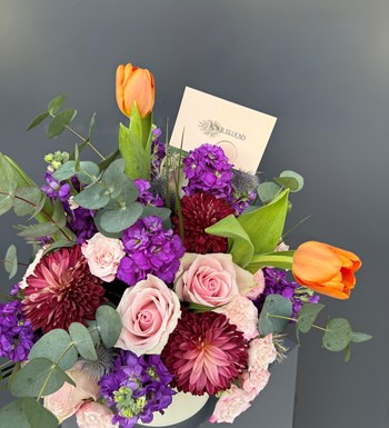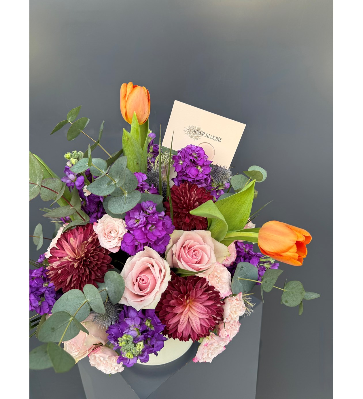 Mor ve tonlarındaki şebboy, gül, anastasia, lale çiçekleri ile hazırlanan mix aranjman