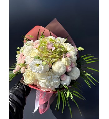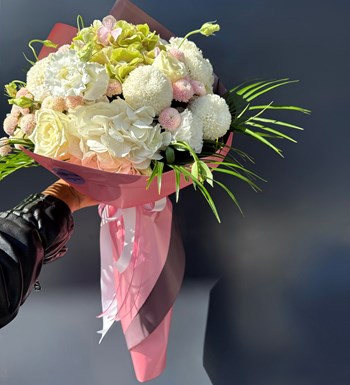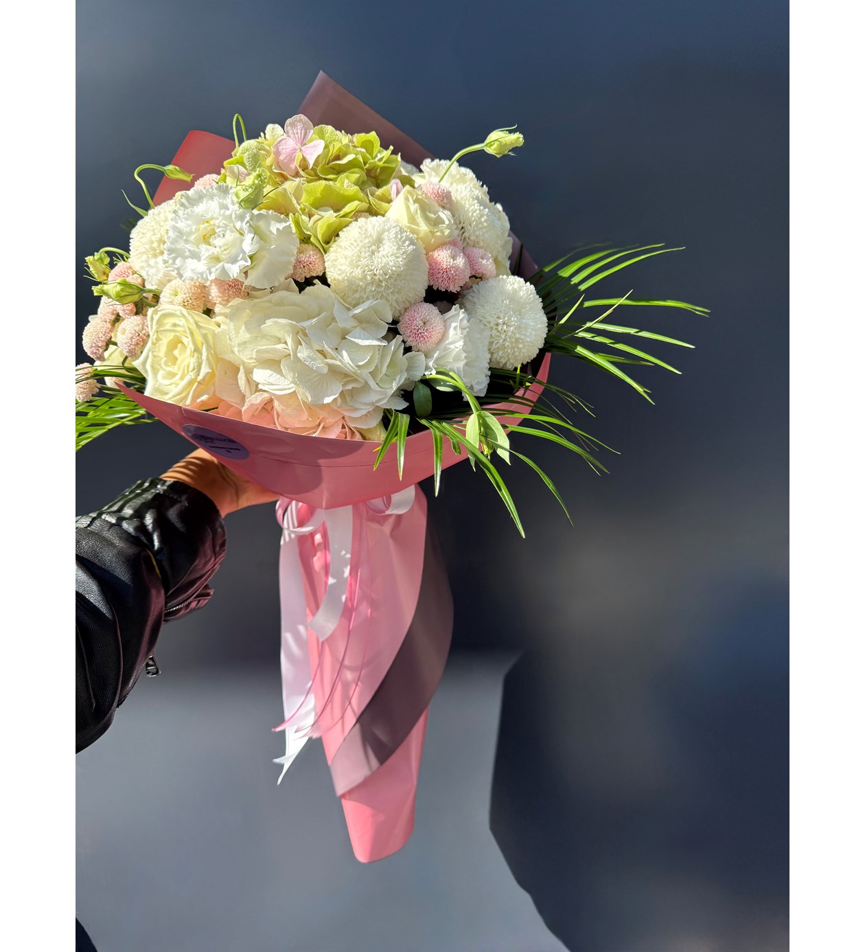 Top anastasia, ortanca, gül ve lisiantus ile hazırlanan soft buket