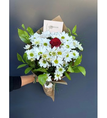 1 adet kırmızı gül ile hazırlanan papatya buketi