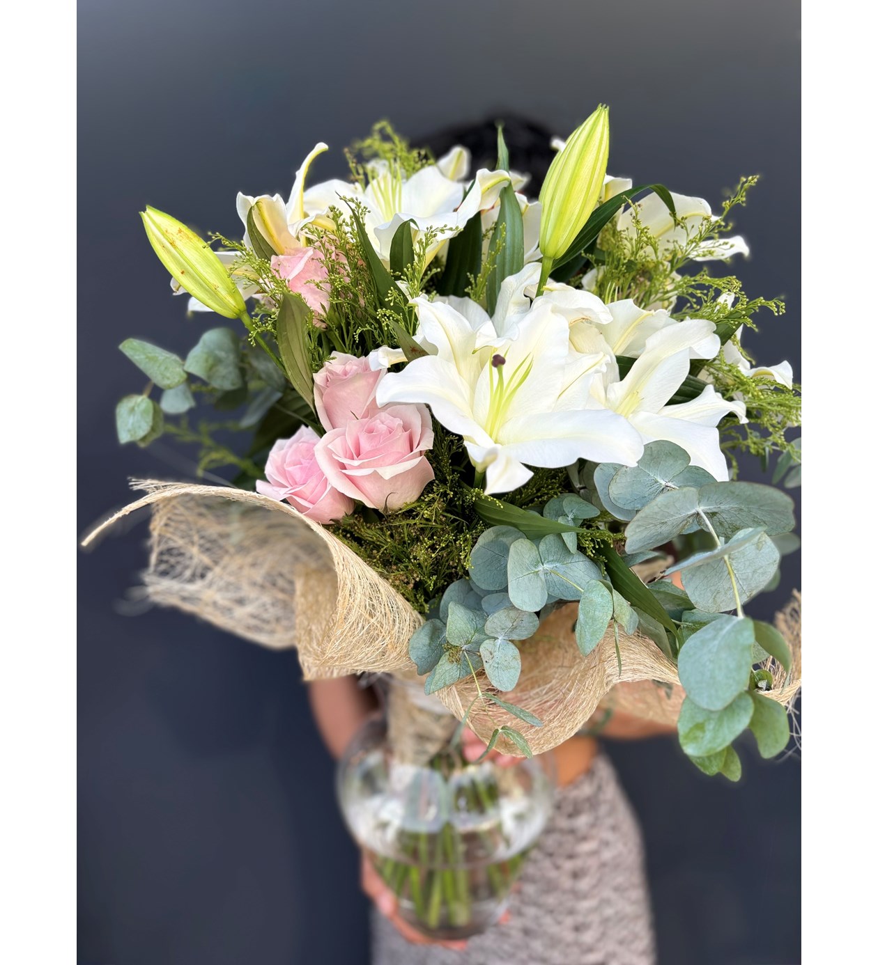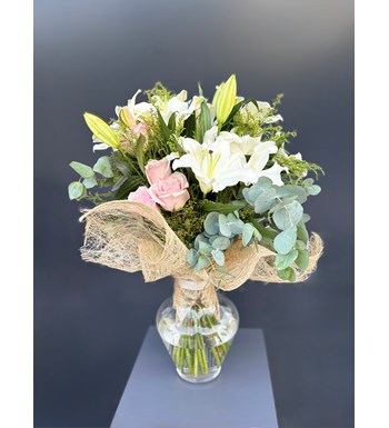 Cam vazoda abaka detaylı beyaz lilyum ve pembe gül buketi