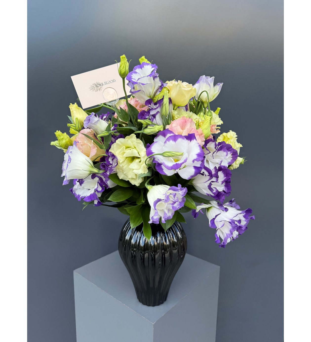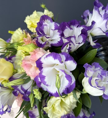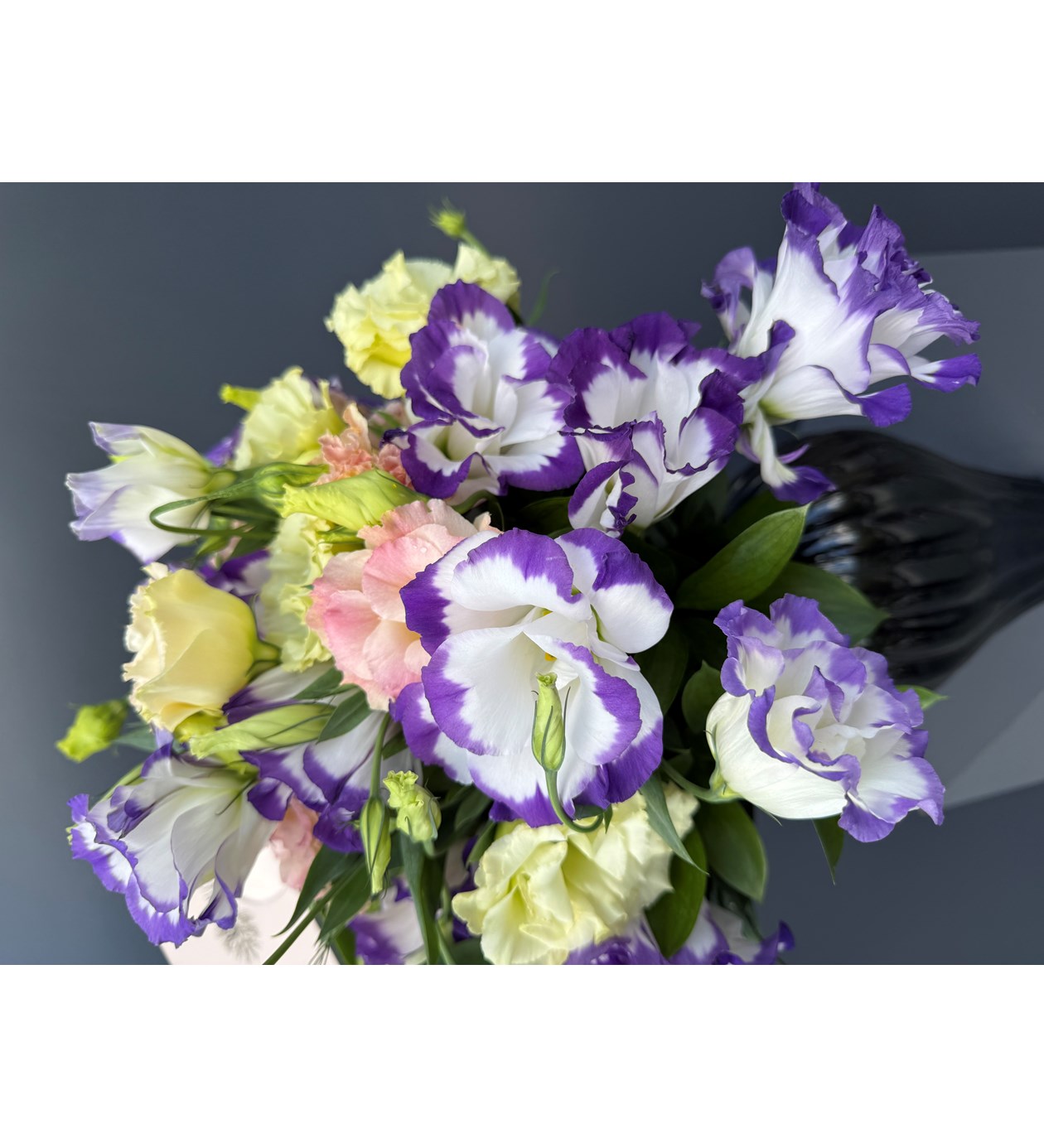 Siyah vazoda özenle hazırlanmış mor, pembe, beyaz lisiantus...