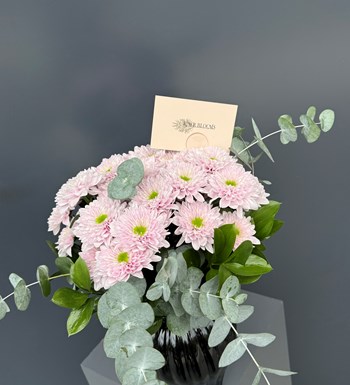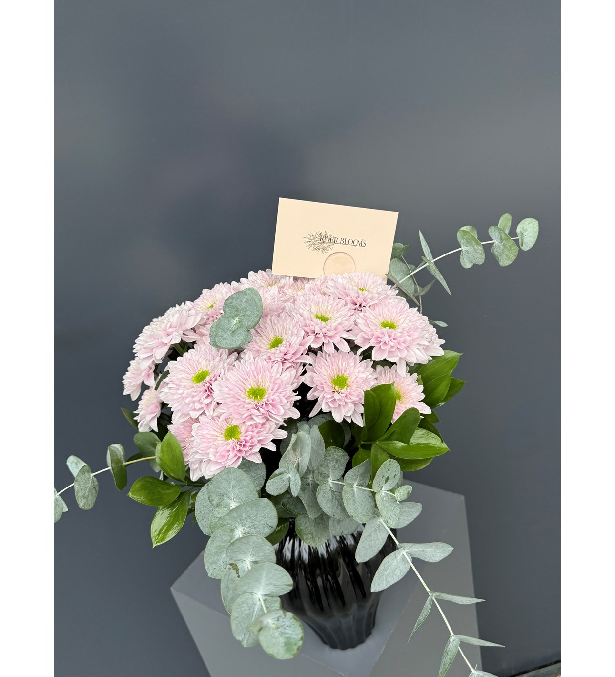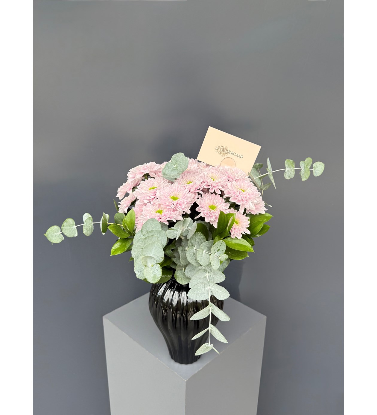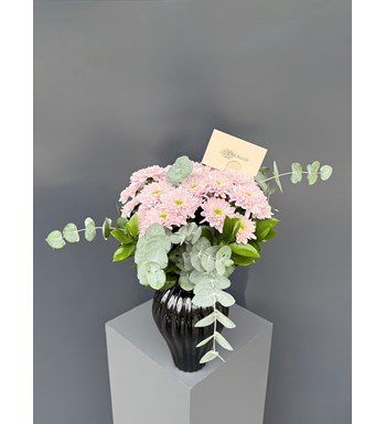 Siyah cam vazoda taze yeşillikler ile özenle hazırlanan pembe kırçiçeği...
