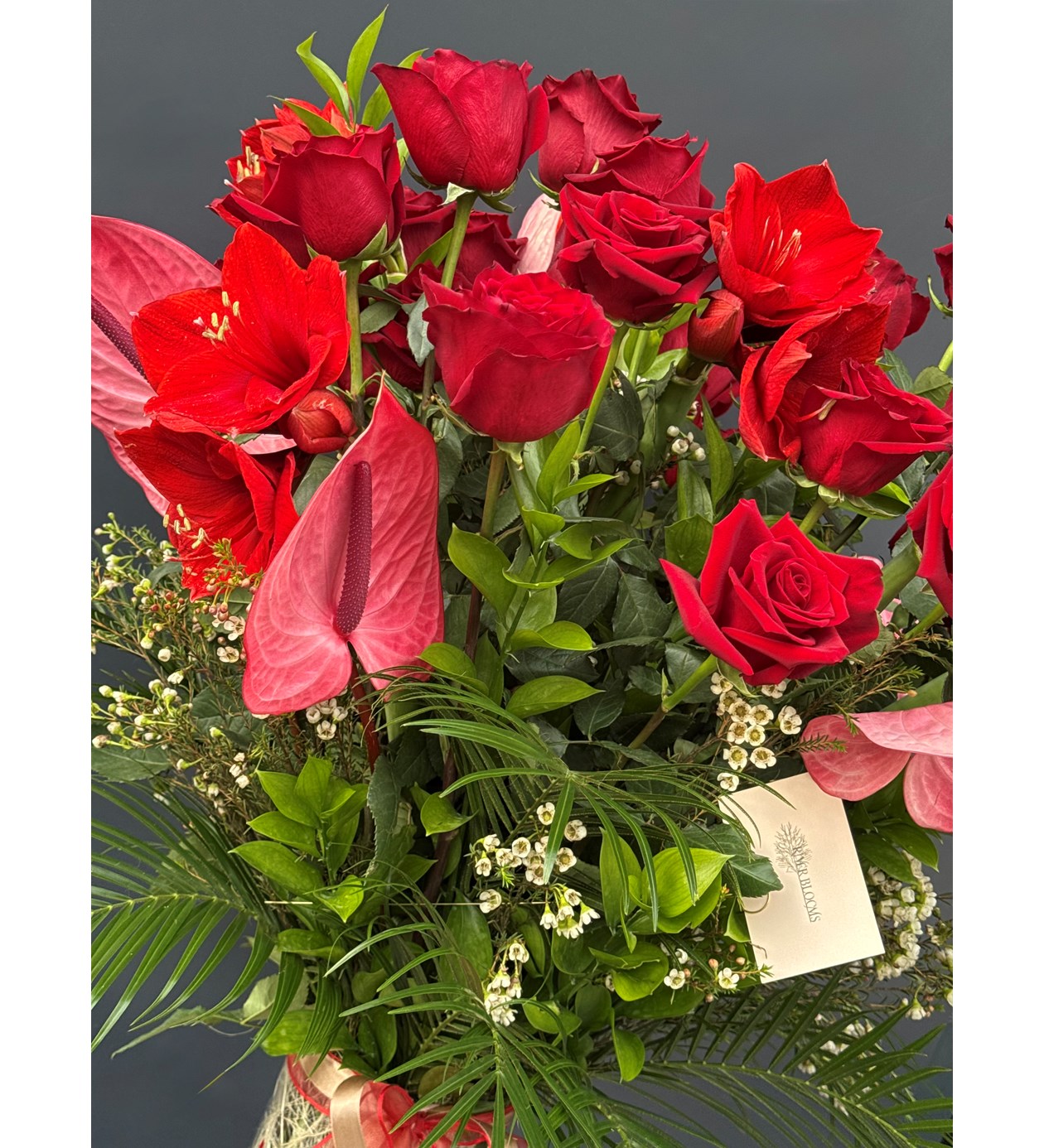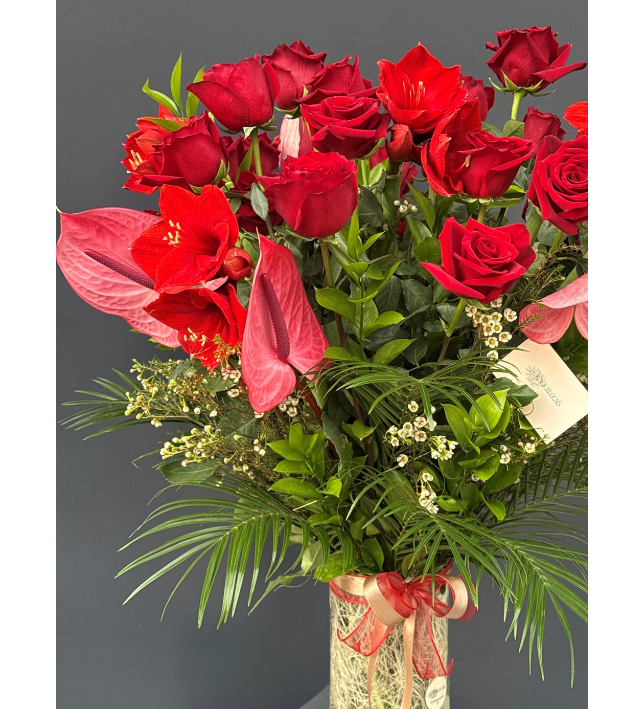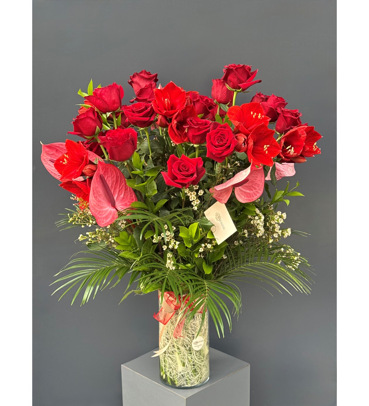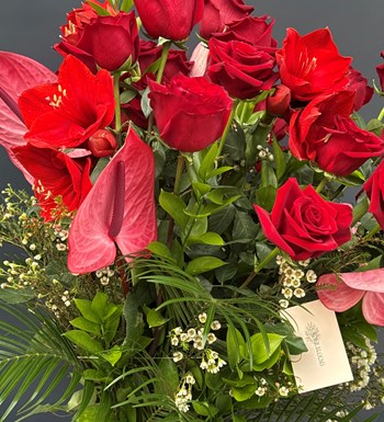Ekvator gülü, Antorium, Amaryllis çiçeği, Vax ve taze yeşillikler ile özenle hazırlanan Vazoda Premium Love Aranjmanı ile kelimelere gerek kalmadan seni seviyorum demek için en doğru tercih...