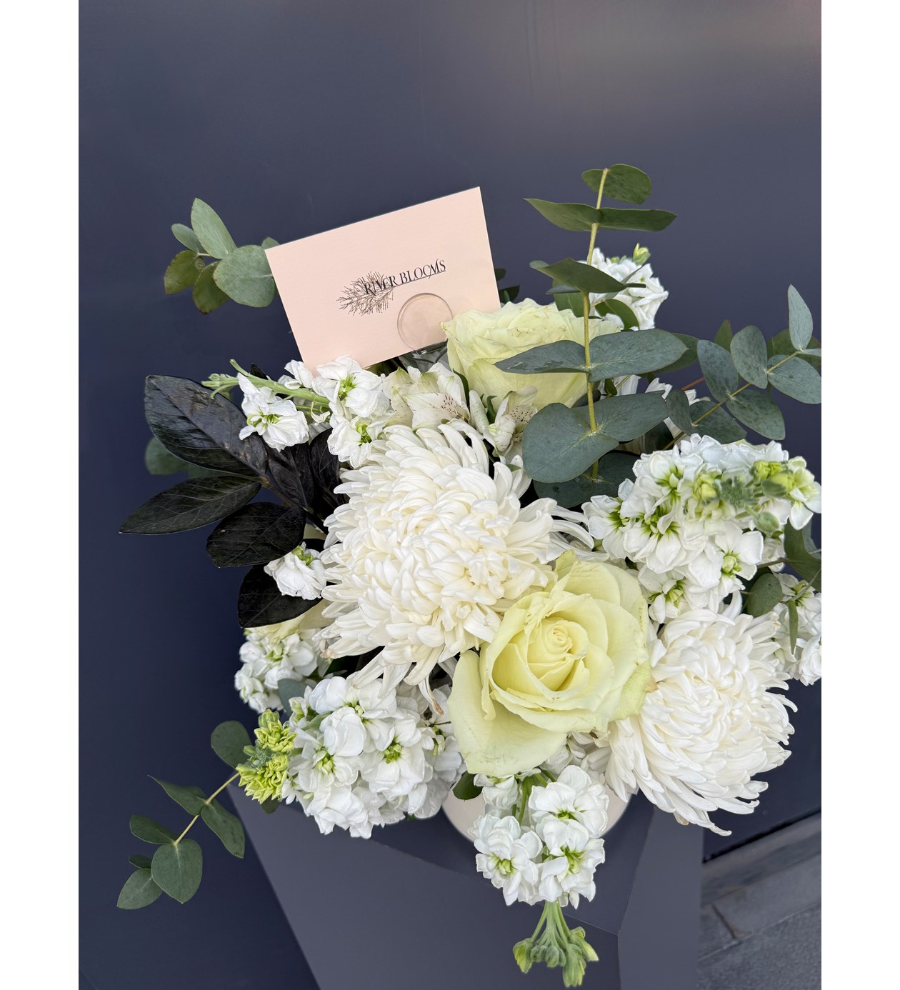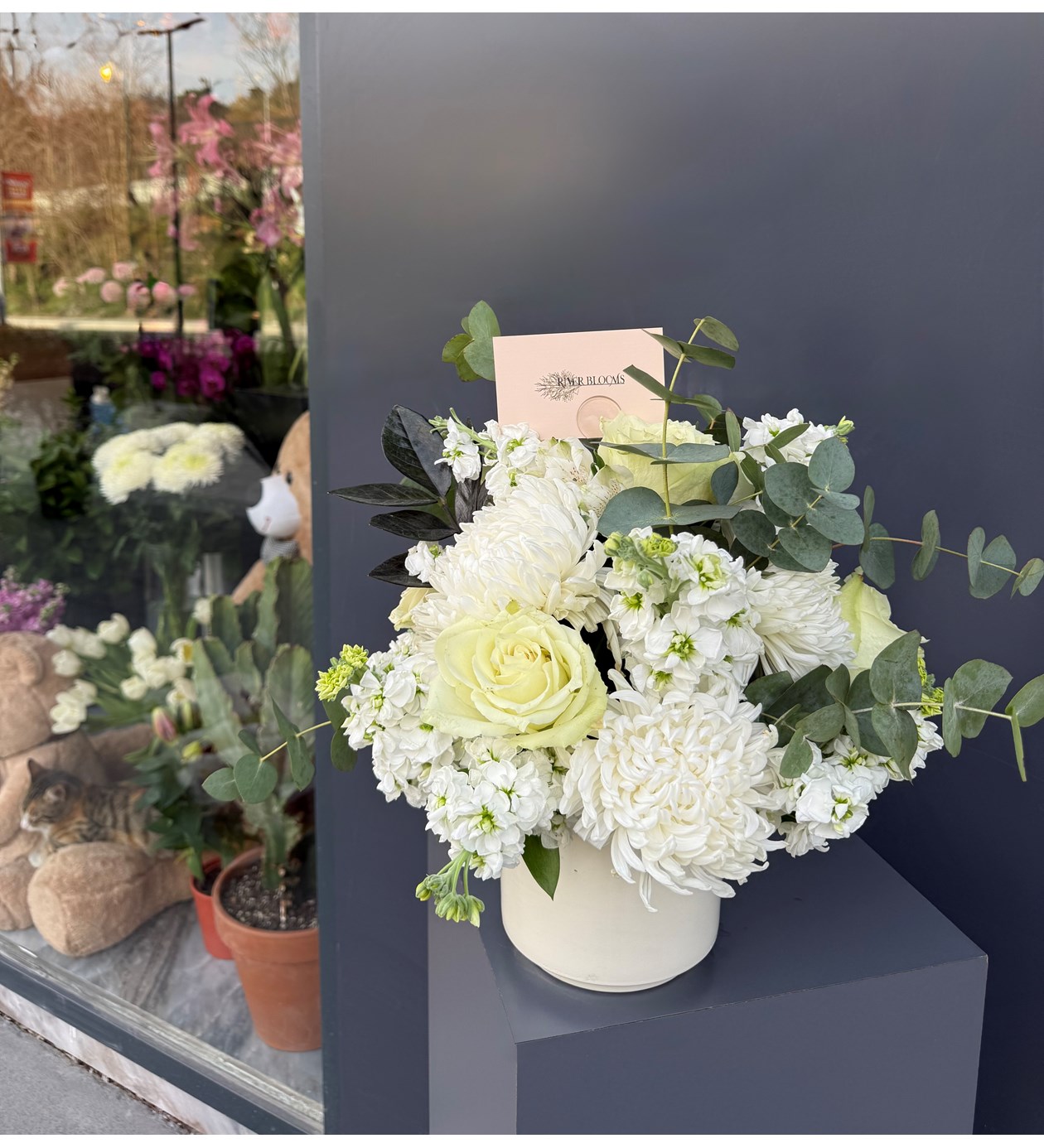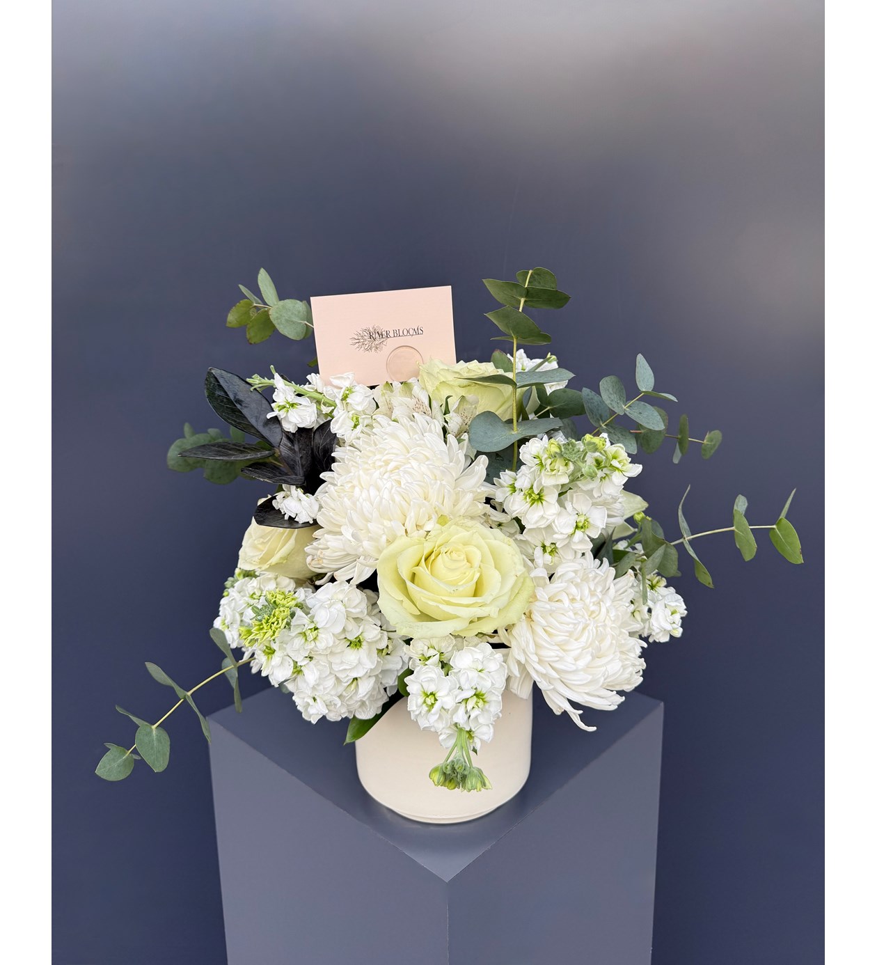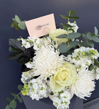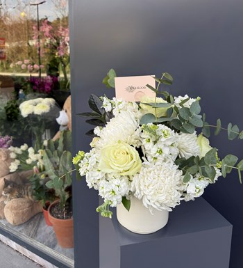 Beyaz anastasia gül ve şebboy çiçekleri ile hazırlanan mix aranjmanı