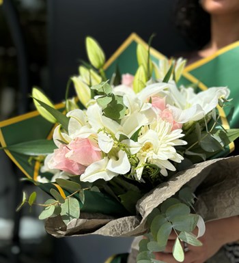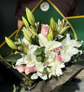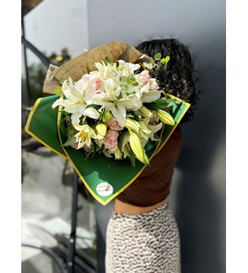 Beyaz lilyum ve pembe gül ile hazırlanan mix buket