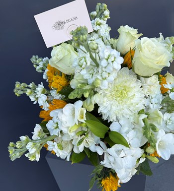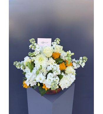 Beyaz şebboy, anastasia, ortanca, gül ve ayçiçeği aranjmanı
