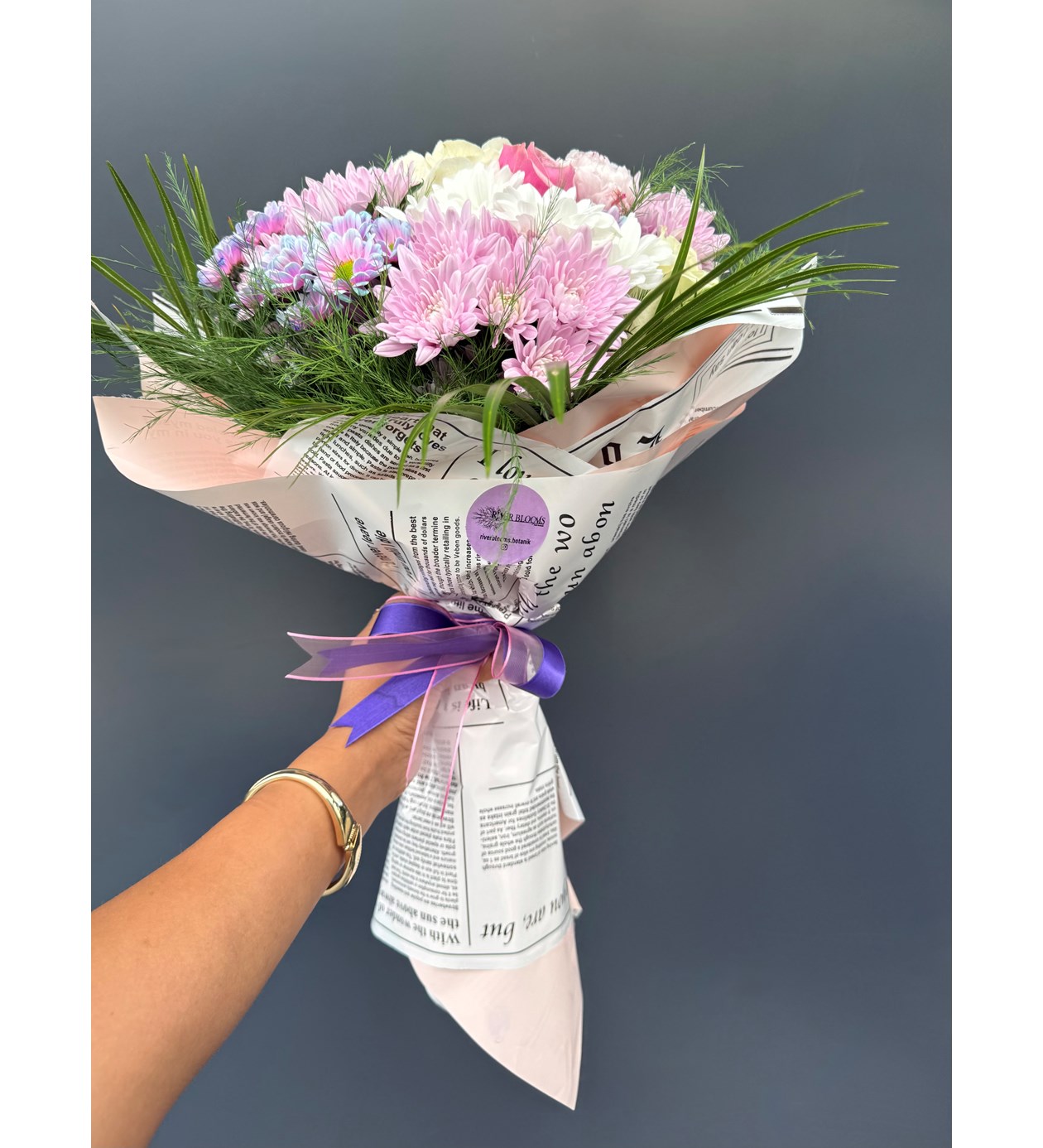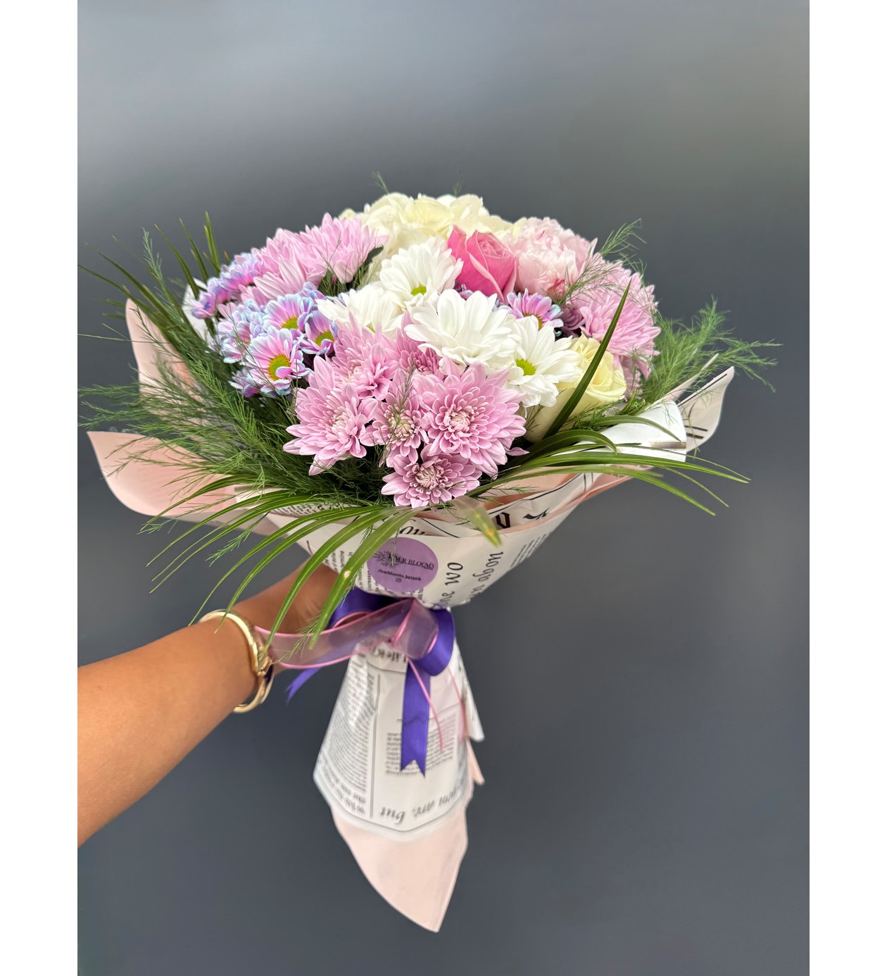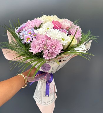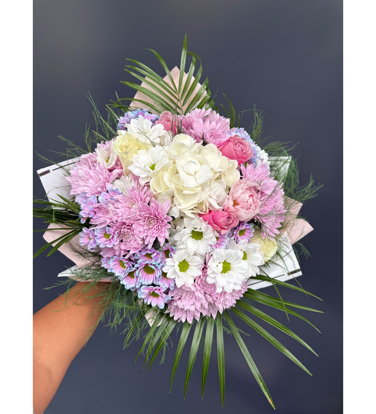 Ortanca, gül, papatya, kırçiçeklerinden pembe ve beyaz tonlarında hazırladığımız mix buket