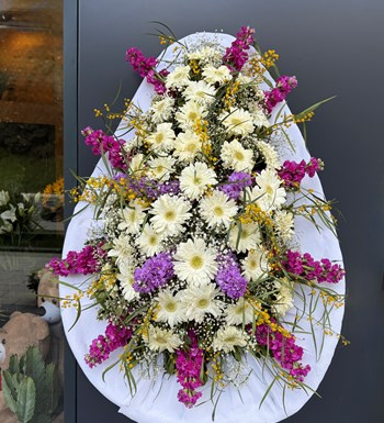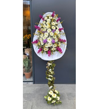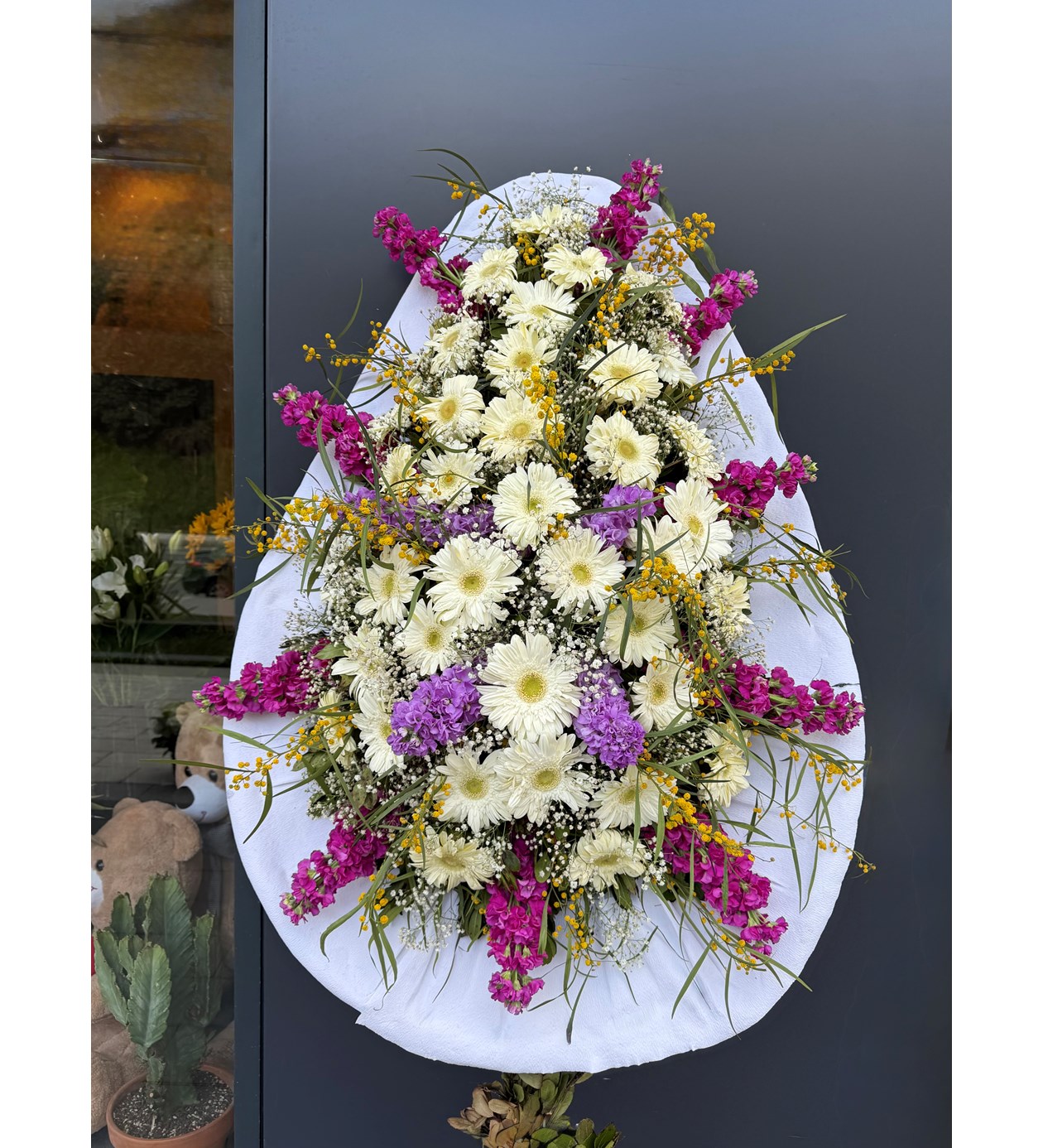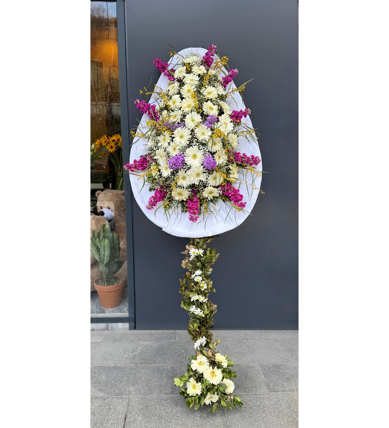 Beyaz gerbera ve pembe, mor şebboy ile hazırladığımız sepet (çelenk) düğün, açılış veya davetleriniz için tercih edebilirsiniz.
